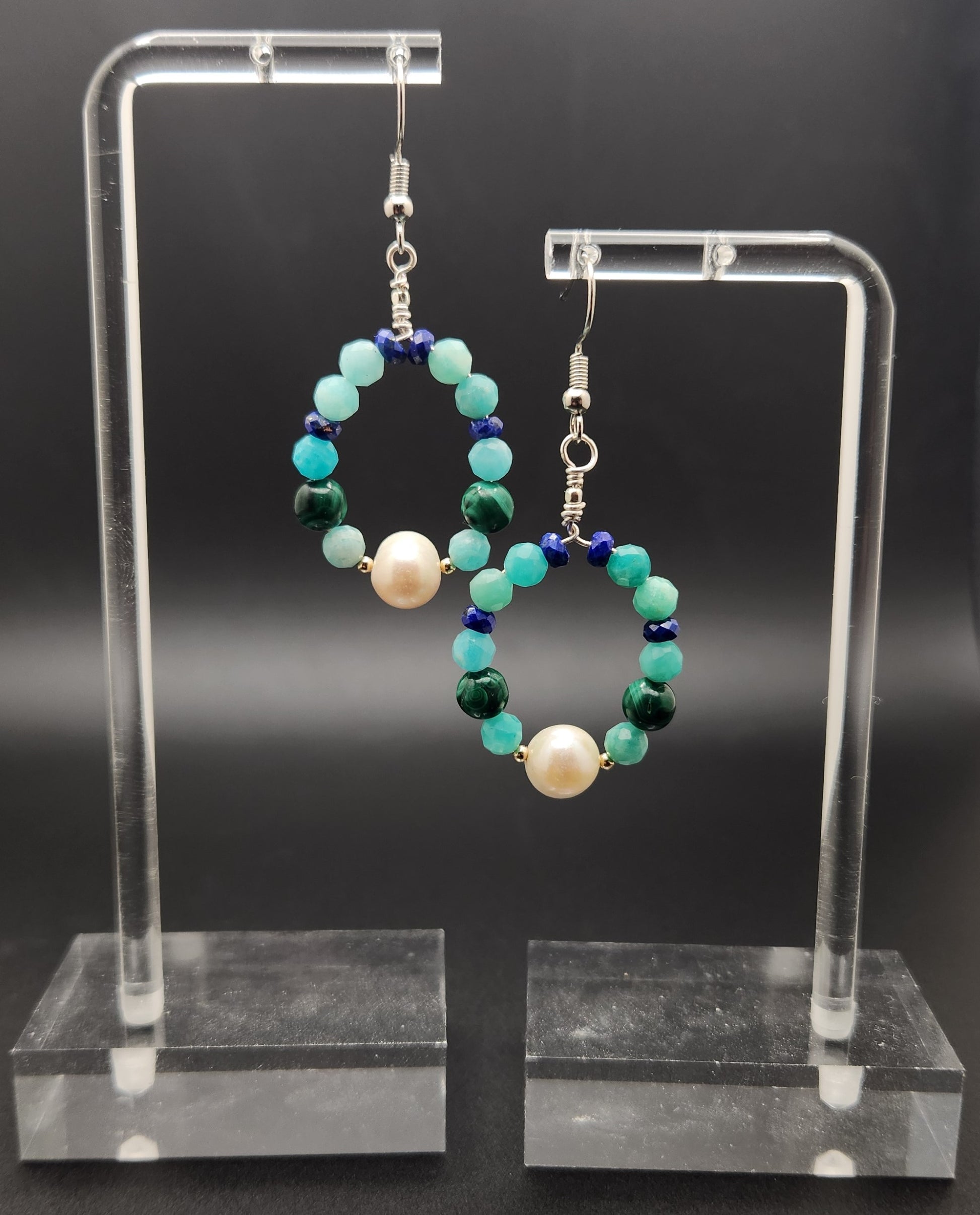 Freshwater Pearl, Malachite, Amazonite Earing