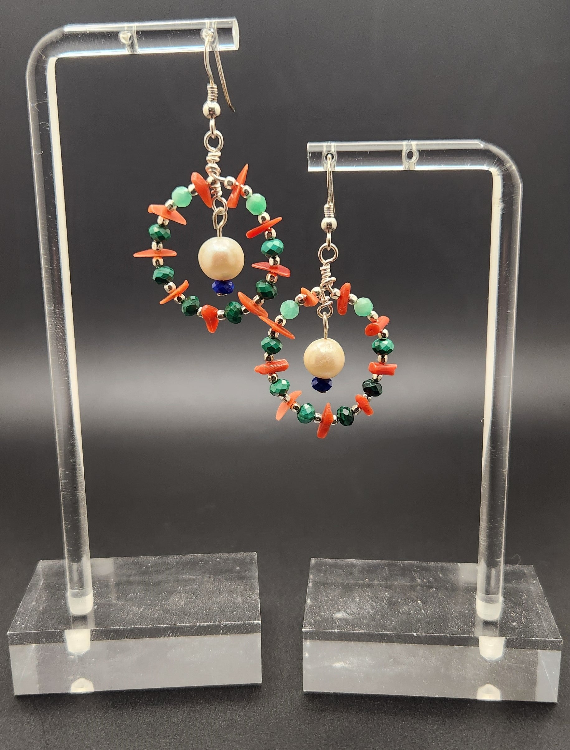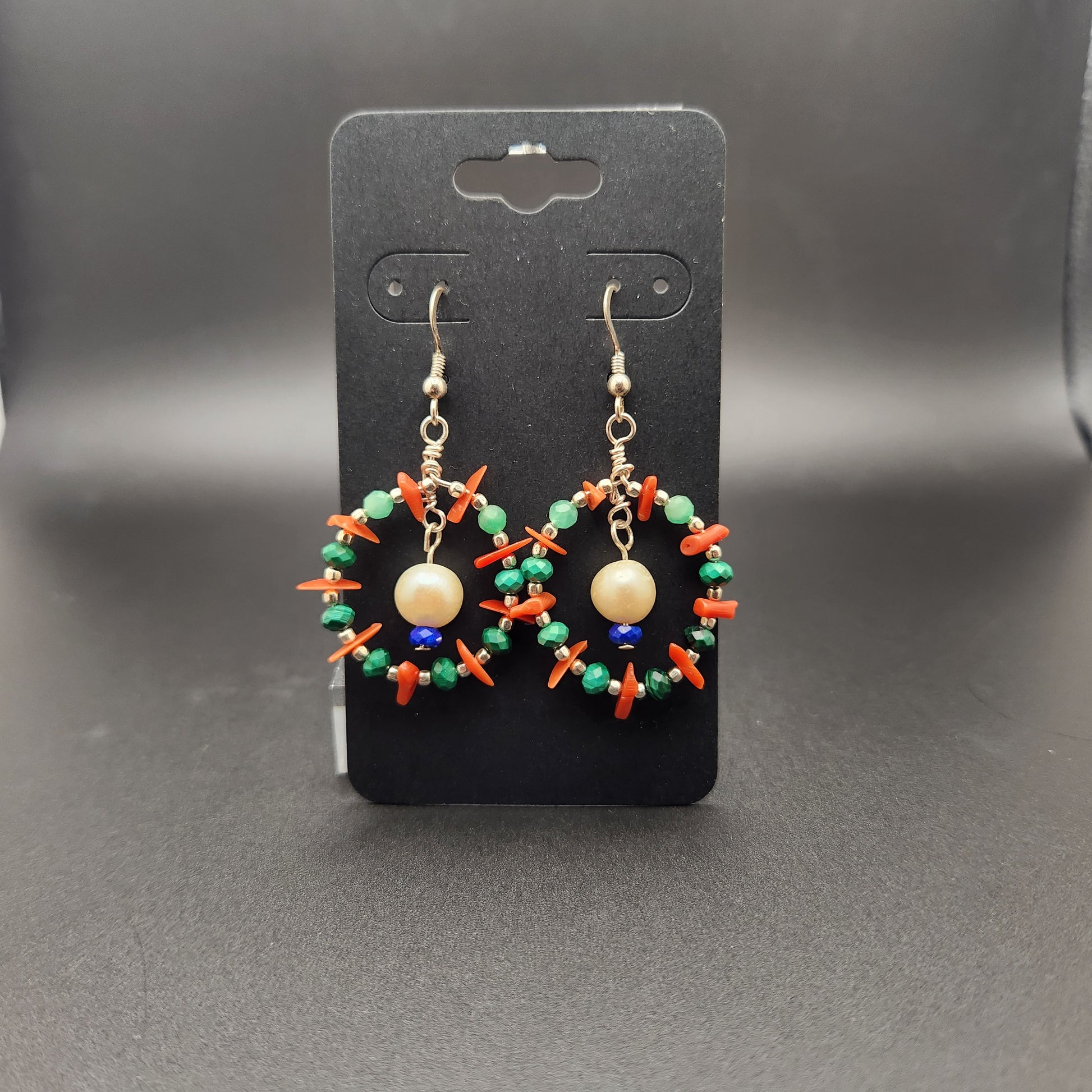 Faceted Natural Green Malachite, Natural Mediterranean Coral Beads, Fresh water Pearl